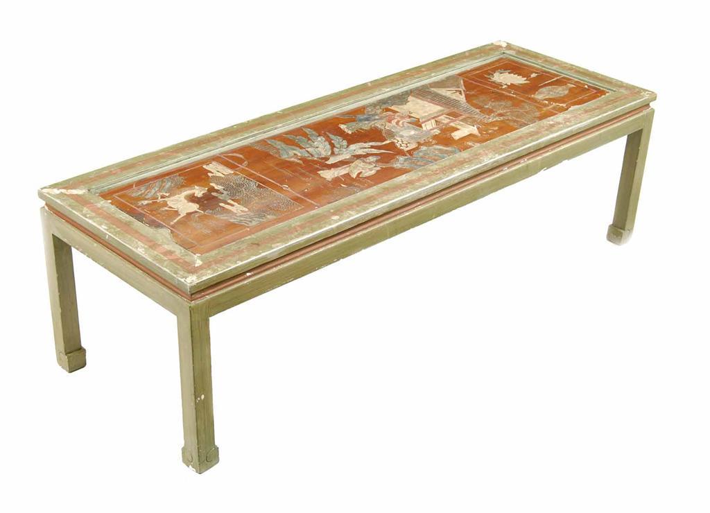 An oriental painted coffee table, inset a lacquered panel decorated with chinoiserie, 17in (43cm) h, 58in (147cm) w, 20.5in (52cm) d. Losses to decoration.
