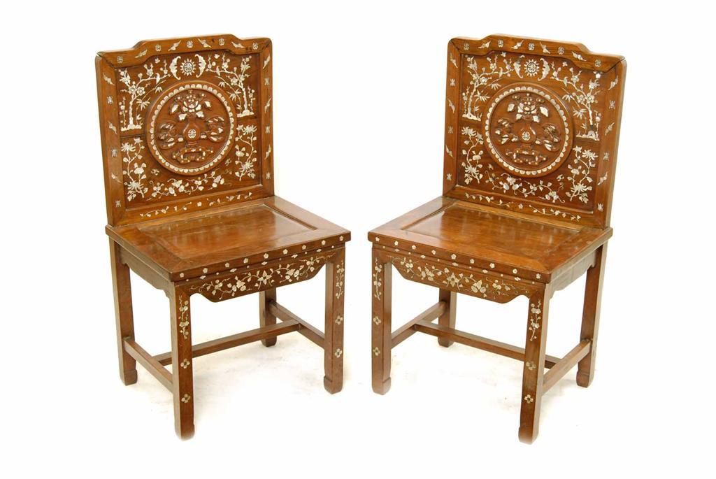 A pair of Chinese carved padouk and mother of pearl inlaid chairs