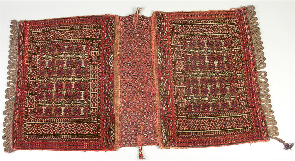 A Turkmen saddlebag, 43 x 25in (109.2 x 63.5cm). Backings missing and re-stitched.