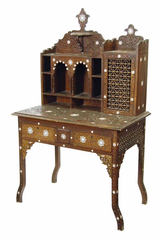 A Moorish carved walnut desk, inlaid bone and mother of pearl, the raised back with pigeon holes and a spindle cupboard door, the base with two frieze drawers, late 19th / early 20th century, 59.5in (151cm) h, 35.5in (90cm) w, 21.75in (55cm) d.