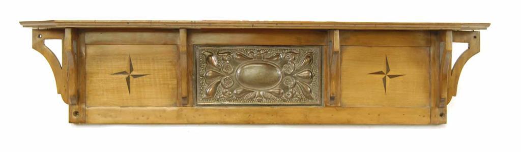 A late Victorian wall shelf, inlaid parquetry stars and inset an embossed copper panel, 9in (23cm) h, 41.25in (104.5cm) w.