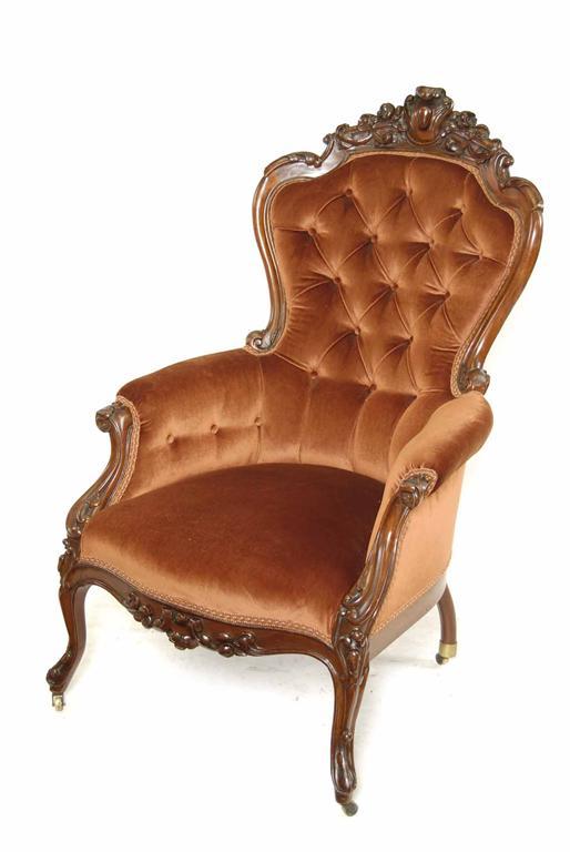 A 19th century mahogany armchair, the carved show frame decorated with a cartouche cresting, flowers and foliage to button upholstered plush fabric on front cabriole to brass castors, with a brass button to the back, numbered '56'.