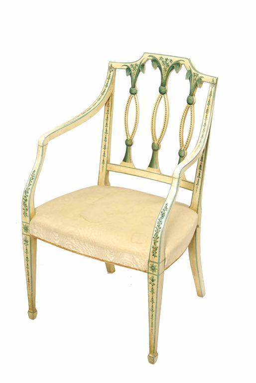 A 19th century open armchair, with later painted decoration, the pierced back to a watered silk stuffed-over seat on square tapering legs and spade feet.