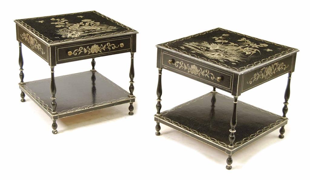 A pair of painted occasional tables, each decorated with stork, flowers and foliage, with a frieze drawer and an undertier, 22in (56cm) h, 22.75in (57.5cm) w and d. (2)