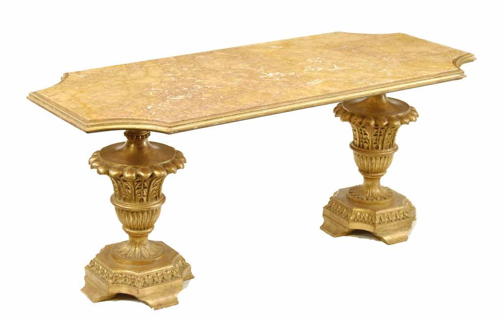 An Italian coffee table, the rectangular Siena marble top with concave corners, on carved giltwood supports, modern, 20.5in (52cm) h, 49.5in (125.7cm) w, 22.25in (56.3cm) d.