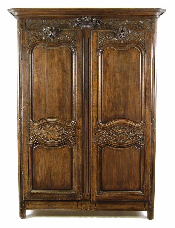 A French provincial carved oak armoire, the detachable moulded cornice above a frieze decorated with leaves and a basket of flowers above a pair of panelled doors, with panels of flowers and musical instruments, the interior with a shelf and later rails, early 19th century and later, 86.25in (218.7cm) h, 62.25in (158cm) w, 25.25in (64cm) d. Restoration, chips to extremities.