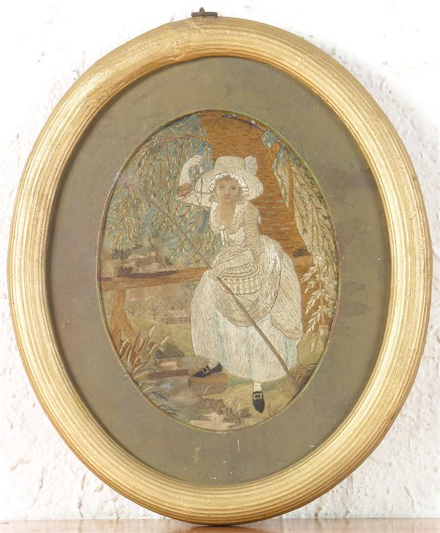 An early 19th century silkwork oval picture, depicting a fishergirl, 7.75 x 6in (19.6 x 15cm).