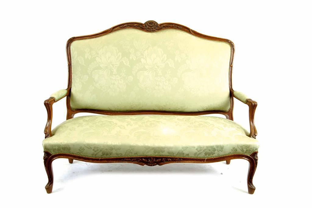 A French Louis XVI style beechwood canape, with a padded back, seat and armrests upholstered green damask, the underside with a retailers label inscribed 'AMEUBLEMENTS, L.?RICON, 10 Rue Venture, 10 MARSEILLE', early 20th century, 45in (113.8cm) h, 57.75in (146.8cm) w, 25in (63.5cm) d.