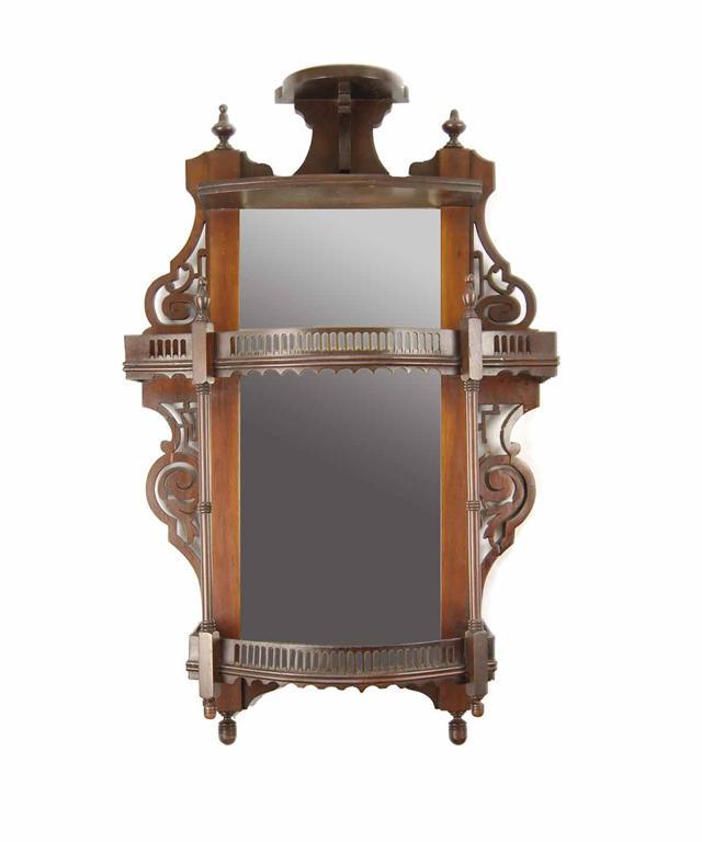 A pair of mahogany wall shelves, each with bevelled mirror backs, urn finials and pierced fret work decoration, early 20th century, 28.75in (72.5cm) h, 17.5in (44.3cm) w, 6.5in (16.2cm) d. (2) Damages.