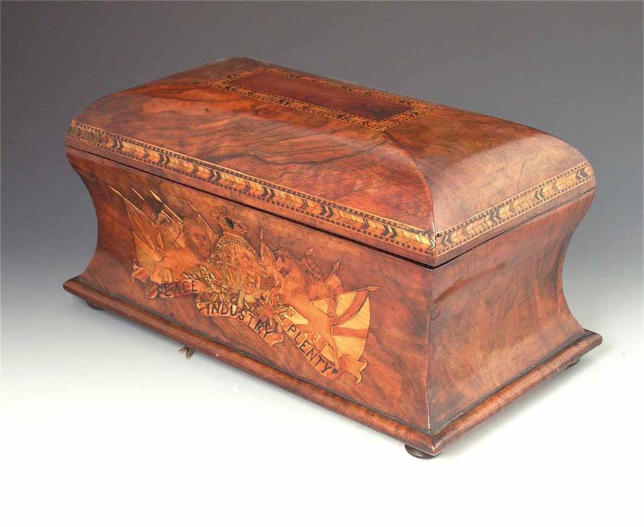 A late Victorian walnut and marquetry heraldic tea caddy