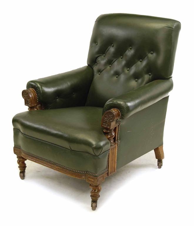 A late Victorian oak armchair, upholstered studded green leather on spiral twist supports and ceramic castors, probably Maple & Co.