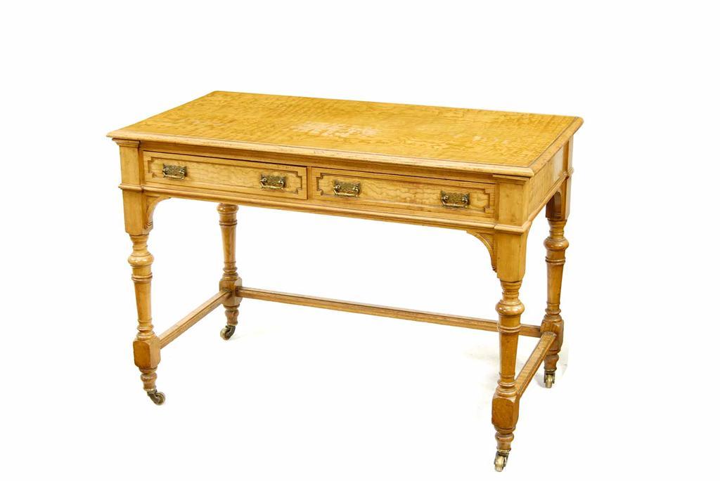 A Victorian ash side table, with two frieze drawers fitted brass handles on turned stretchered supports, on brass castors, 29in (73.8cm) h, 41.75in (106cm) w, 21.25in (54cm) d.
