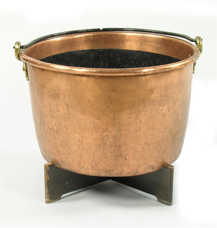 A large copper log bin, with iron swing handle, 13.5in (34.2cm) h, 20.25in (51.4cm) diameter.