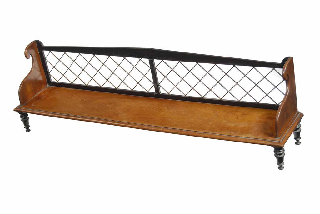 A Victorian mahogany and ebony bookstand, with shaped sides and a brass grille back, on turned tapering supports, 12.5in (31.4cm) h, 43in (109.5cm) w, 7.75in (19.6cm) d.