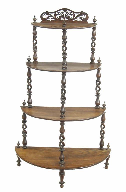 A Victorian rosewood four tier etagere, with pierced spiral twist supports, 45in (114cm) h, 27in (68.5cm) w, 12.25in (31.4cm) d.