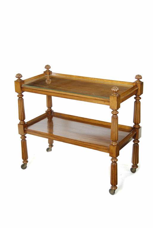A Victorian mahogany two tier buffet, on reeded supports and later castors, 31.75in (81cm) h, 34.5in (87.6cm) w, 16in (41cm) d. Restored.
