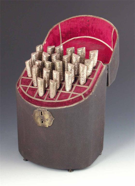 A George II shagreen knife box, the hinged lid enclosing a plush lined divided interior containing twelve silver handles knives and forks, marked 'JW' for John Wood, the base with a paper label inscribed 'The Property of the late Harrison W. Weir, The Well known Artist, (Sold by Order of the Executors).', 12.5in (31.6cm) h, 8.75in (22cm) w.