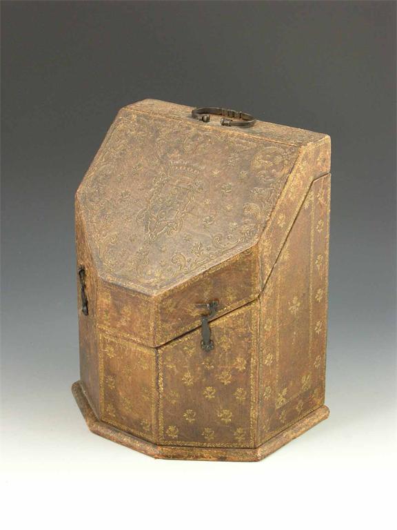A gilt tooled leather stationery box, the sloping lid decorated a coat of arms to a divided interior, 10.75in (27cm) h, 8.25in (21cm) w, 6.5in (16.5cm) d. Splits to leather.