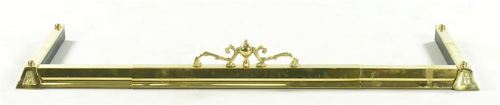 A brass adjustable fender, with a scroll and globe surmount, 5.5in (14cm) h, 52in (132cm) w, closed, 16in (40.6cm) d.