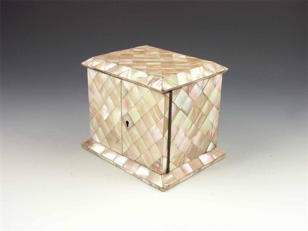 A Victorian mother of pearl dressing table chest, with all over quilt effect and a pair of ivory edged doors and three sycamore fronted drawers, with silk and plush linings, 6.25in (16cm) h, 7.5in (19cm) w, 6in (15cm) d.