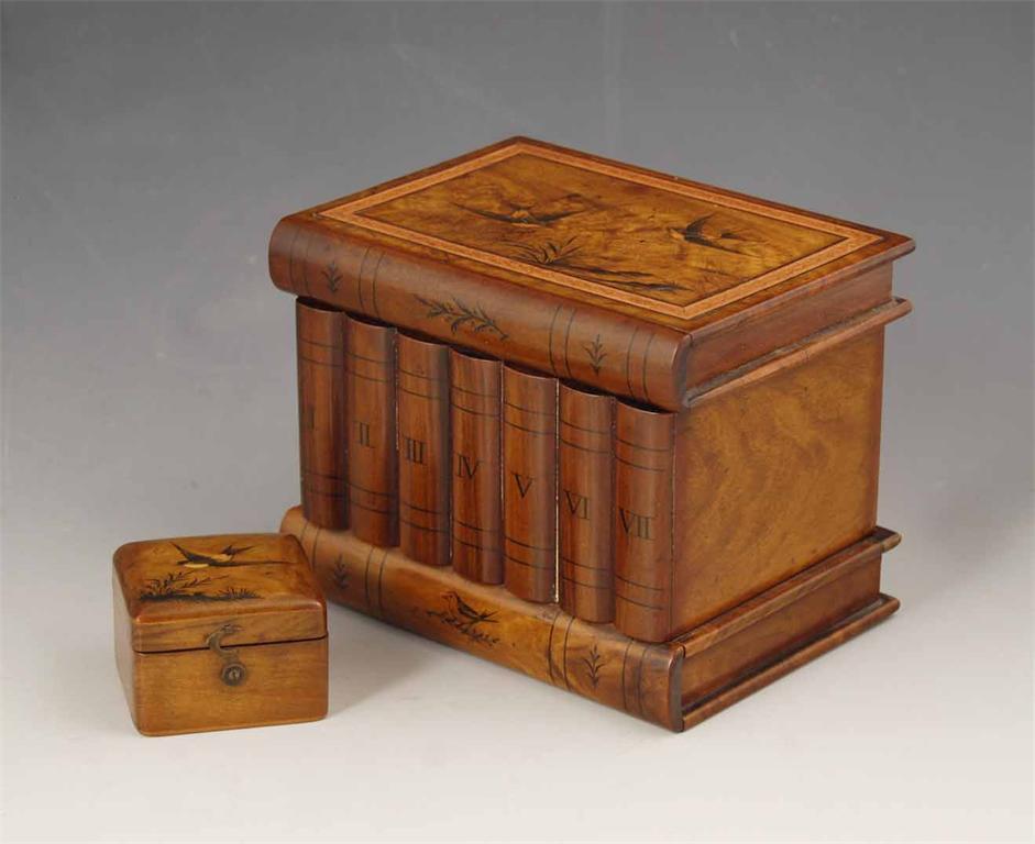 A 19th century Sorrento olivewood box, modelled as books with a sliding base and hidden key escutcheon, the hinged cover with marquetry swallows, to a plush lined interior, 4.25in (10.5cm) h, 5.25in (13.1cm) w, 4in (10cm) d, and a similar stamp box. (2)