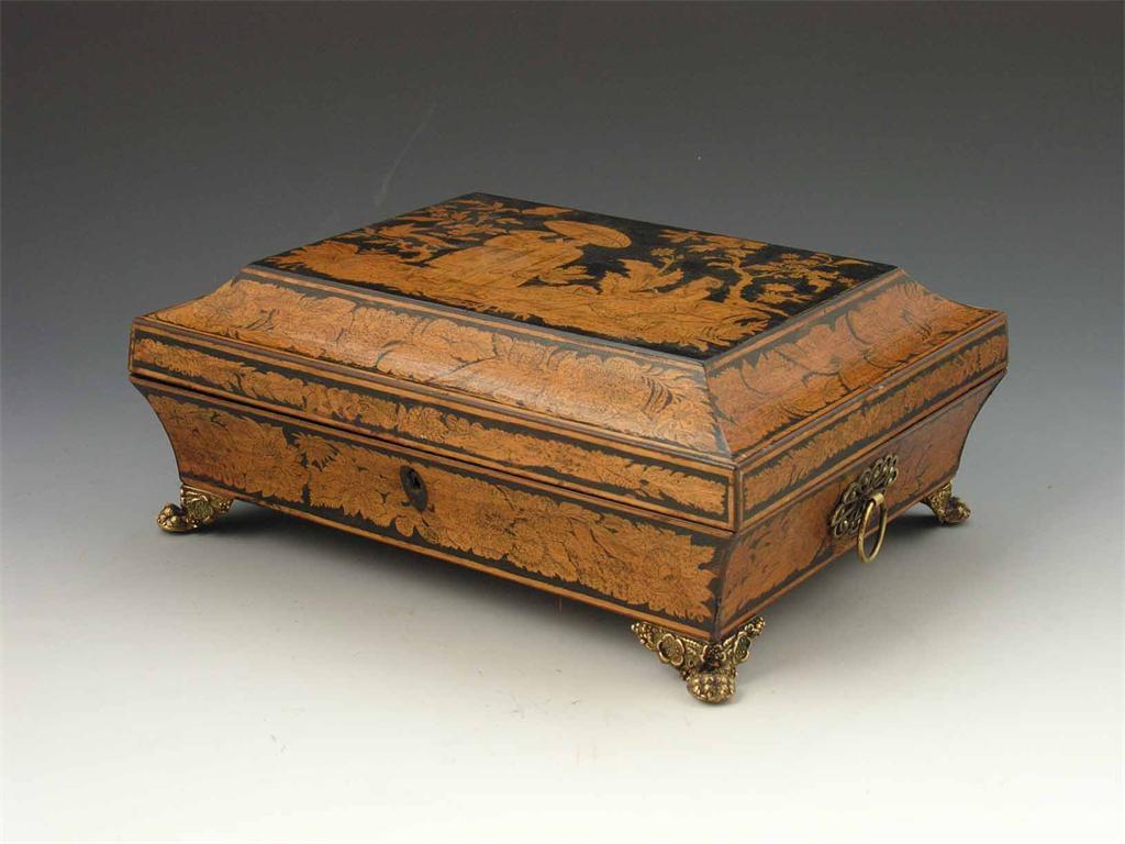 A Regency penwork card box, of sarcophagus shape the hinge lid decorated with oriental figures, trees, a bird and a butterfly, the box overall decorated with bands of flowers and leaves, the divided interior to cast gilt brass feet, 4.25in (10.7cm) h, 10.75in (27cm) w, 8.25in (21cm) d. Restoration.