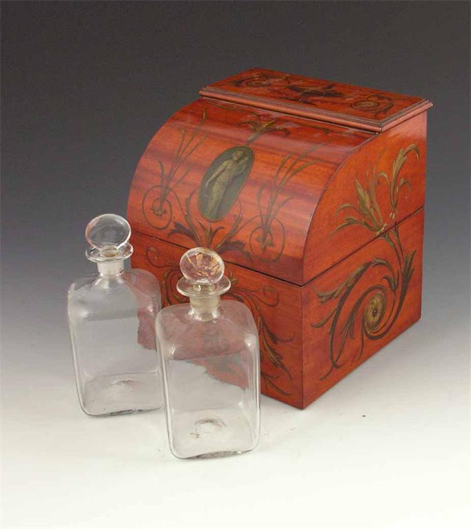 A painted satinwood decanter box, decorated foliate scrolls, paterae and an urn, the plush lined interior with four decanters and stoppers and one glass, 8in (20.2cm) h, 7.25in (18.3cm) w, 7in (17.5cm) d.
