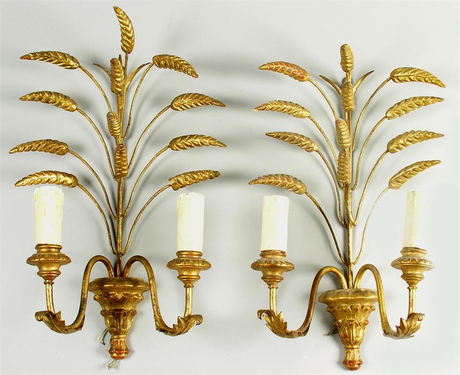 A set of four Italian giltwood and metal twin branch wall lights, 17 x 11.75in (43 x 30cm). (4)