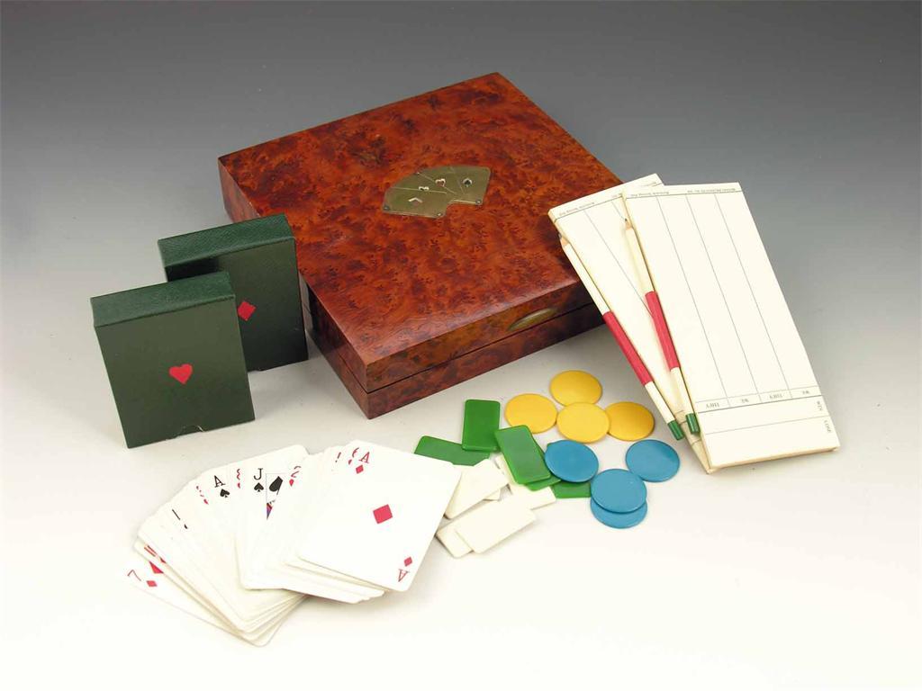 An amboyna bridge box, the lid applied with four pierced brass card, the interior fitted with cards, scoring pads and counters, 8.5in (21.6cm) w.