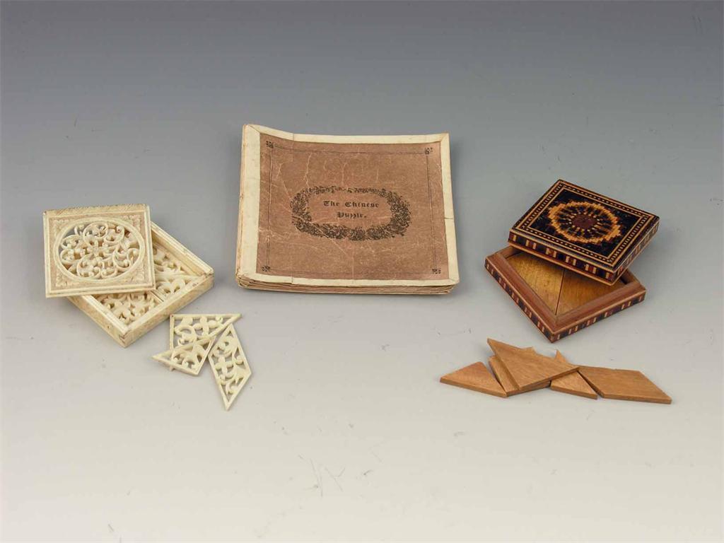 A 19th century Chinese export pierced ivory puzzle, in a pierced covered box containing six segments to make two squares, 2in (5cm) sq, another puzzle in wooden blocks contained within a Tunridgeware style box, the underside inscribed 'Charles Aitken, Broduff, 7 Blooomsbury Square, London, WC', together with a small pamphlet 'The Chinese Puzzle'. (3)