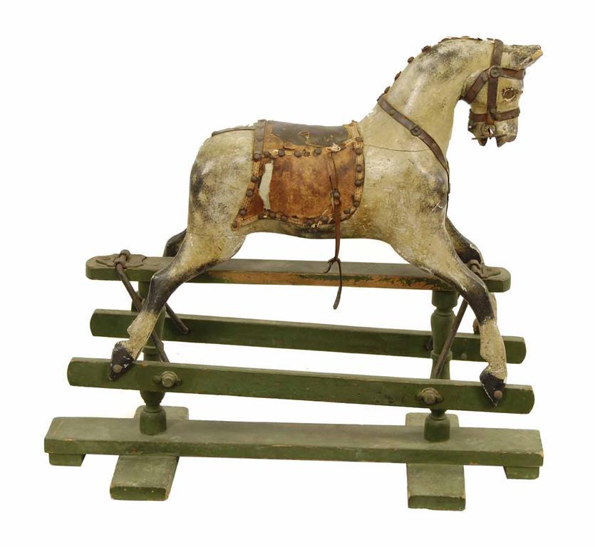 A carved wood and painted dapple grey rocking horse, on a trestle rocker, early 20th century, 32.25in (81.7cm) h, 36in (91.5cm) w, 14in (35.5cm) d. Losses.