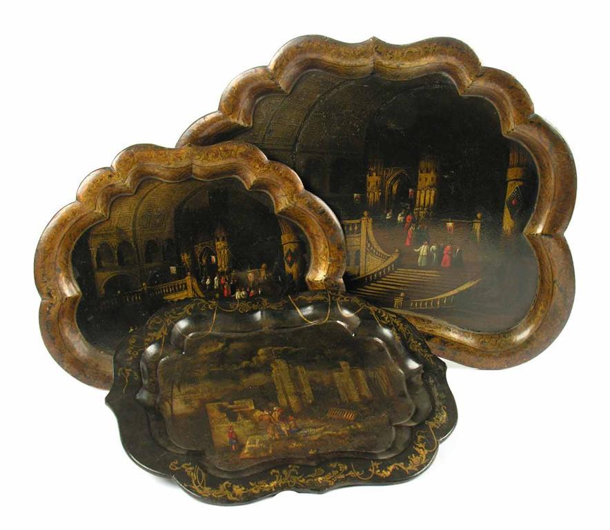 A Victorian papier-mache tray, the centre painted an Oriental scene with figures amongst ruins, 17.25in (43.6cm) w, 13.5in (34.5cm) d.