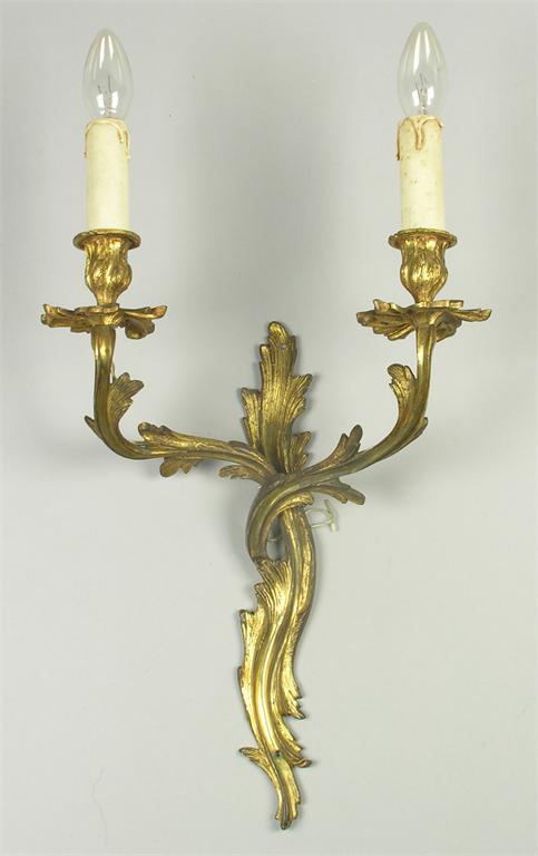 A pair of ormolu two branch wall lights, fitted for electricity 20in (50.8cm) h, 11.5in (2.2cm) w, 6.5in (16.5cm) d. (2)