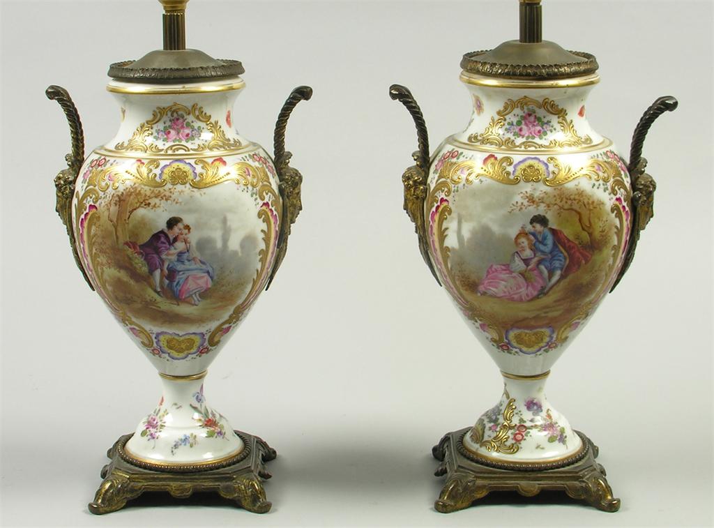 A pair of continental painted porcelain and gilt metal mounted table lamps, decorated landscapes and romantic scenes, 13.5in (34.2cm) h, with shades. One stem with chip.