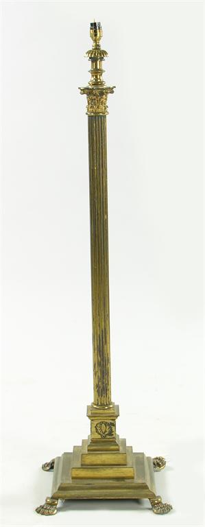 A late Victorian lacquered brass adjustable standard lamp, with a Corinthian capital to a stepped base on paw feet, 44in (111.8cm) h.