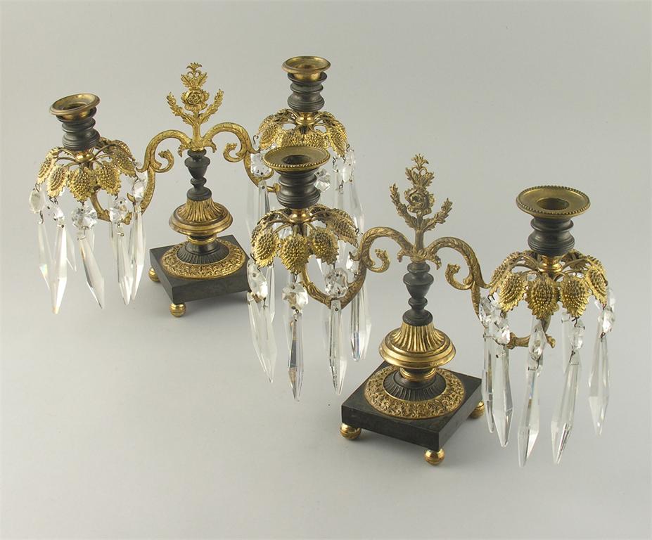 A pair of early 19th century bronze and gilt brass twin branch candelabra, hung with cut glass lustres, with differing detachable sconces, 9.25in (23.5cm) h, 11.5in (29.2cm) w. (2)