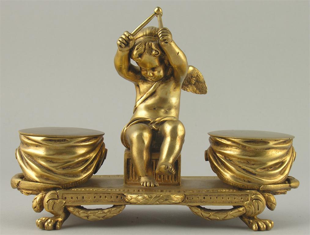 A French gilt brass ink stand, modelled as a cherub holding a pair of drumsticks to a pair of draped drums with hinged covers, 5in (12.6cm) h, 8in (20.3cm) w.