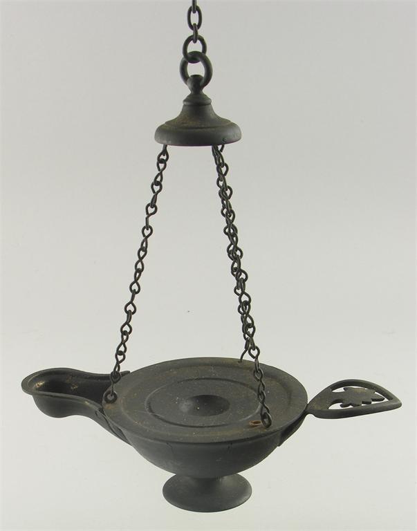 A 19th century bronze hanging oil lamp, 2.75in (7cm) h, on suspension chains.