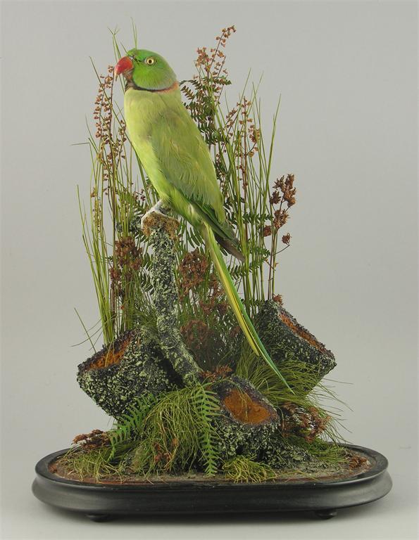 A Victorian green parrot, on a naturalistic mount and under a glass dome, 18.5in (47cm) h.