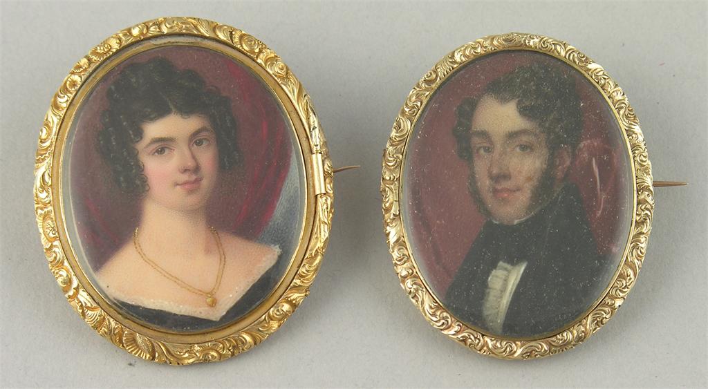 A pair of Victorian oval portrait miniatures, depicting a young lady and young man, mounted in gilt brooch frames, the versos with hair, in leather cases. (2)