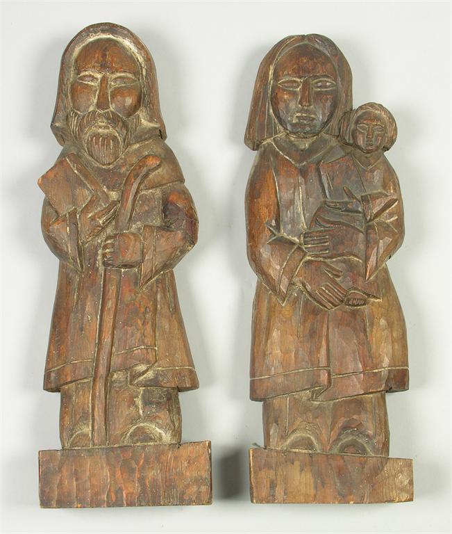 A pair of continental naive carved pine flat back figures, 18.25in (46.2cm) h. (2)