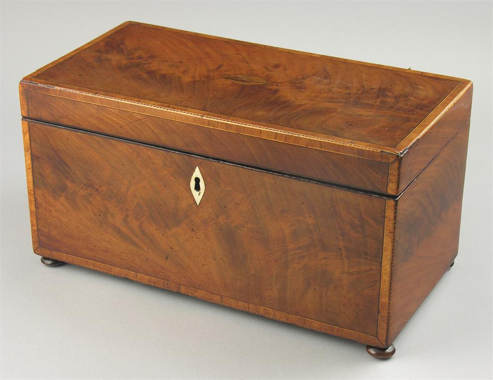 A 19th century rectangular mahogany tea caddy, with kingwood crossbanding and stringing, the interior with a pair of hinged canisters and later glass bowl, 6.5in (16.5cm) h, 12.5in (31.7cm) w, 6.5in (16.5cm) d. The cover handle missing and replaced with a rosewood patch.