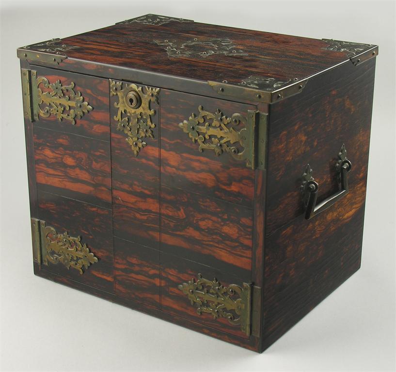 A Victorian coromandel and brass mounted cigar table cabinet, having two divided drawers enclosed by a pair of doors, the brass lock stamped 'Bramah, London', 11in (28cm) h, 12.75in (32.4cm) w, 9.5in (24cm) d.