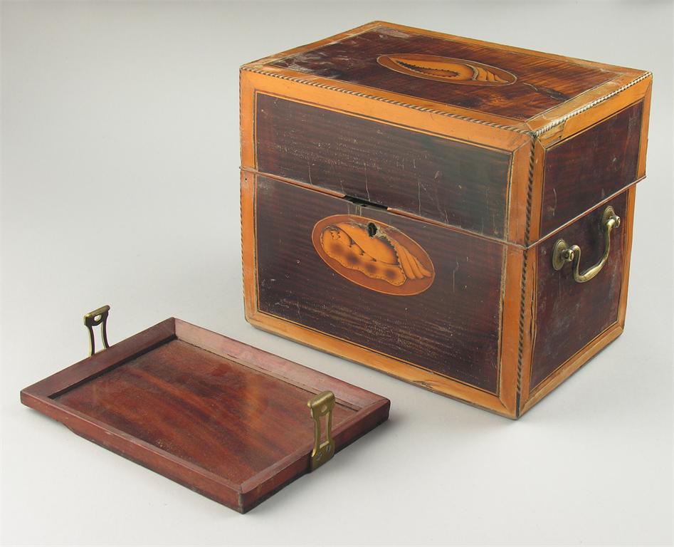 A late 18th Century Dutch harewood and marquetry inlaid travelling tantalus, satinwood banded and inlaid stringing, the divided interior with a mahogany tray, 8.5in (21.5cm) h , 10in (25.4cm) w, 7in (17.8cm) d. Hinges and part of lock missing.