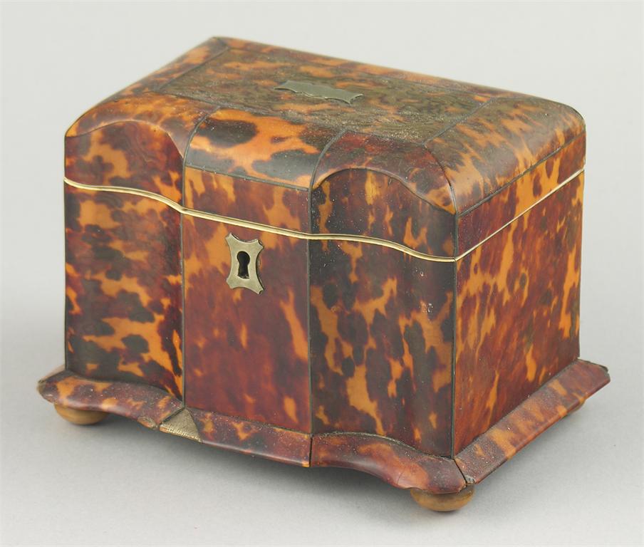 A Regency tortoiseshell tea caddy, inlaid pewter stringing with ivory edges, the arc d'arbelet front to a divided interior with a single cover, on turned vegetable ivory feet, 4in (10.2cm) h, 5.75in (14.6cm) w, 4.25in (10.7cm) d.
