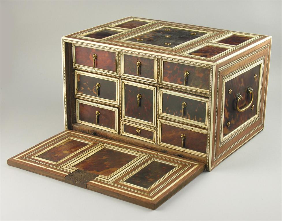 An 18th Century Indo-Portugese tortoiseshell, ivory and rosewood table cabinet, with gilt metal mounts, the fall revealing an arrangement of seven drawers, 9.25in (23.4cm) h, 15.25in (38.6cm) w, 11in (28cm) d