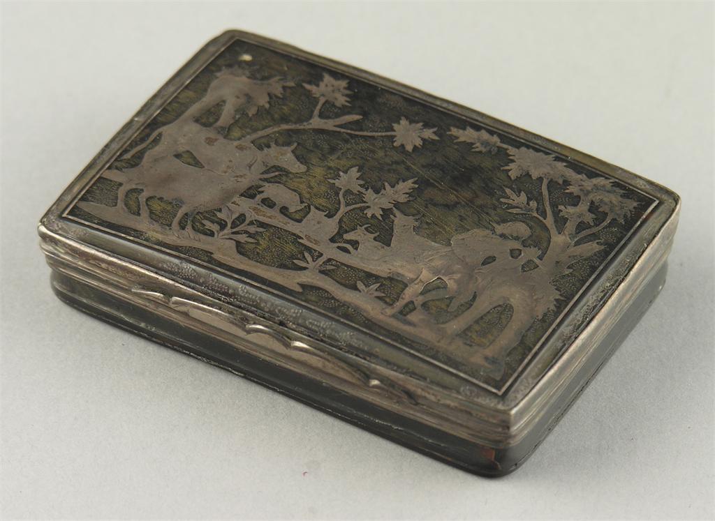 An early 18th century tortoiseshell and niello box, the hinged cover decorated a herdsman playing a flute, 3in (7.6cm) w.