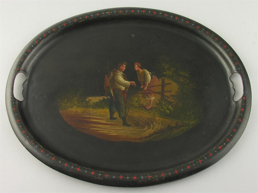 A late 19th century Russian tole oval tray, the centre painted figures by a fence, the underside with worn stamps, 13.75in (35cm) w. Provenence - The George Lowe Collection.