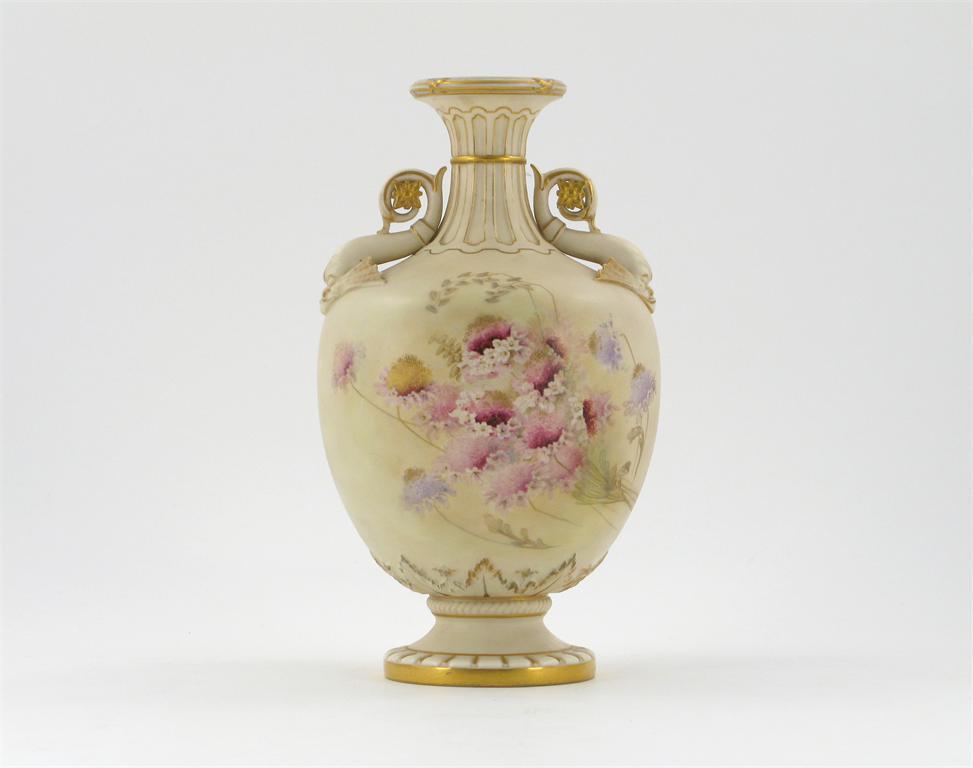 A Royal Worcester vase, with dolphin handles, decorated with textured scabious flowers above an acanthus leaf border, printed mark, c.1900, restored, 16.5cm.