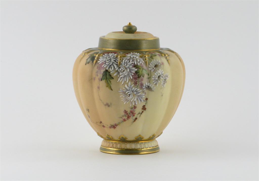 A Royal Worcester pot pourri vase and inner cover, the fluted blush body painted with blown white chrysanthemums and delicate flower trails below a raised green border, printed mark and date code for 1899, outer cover lacking, 13cm. (2)